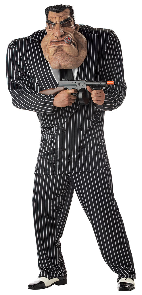 Product Description: He paid his dues and now this big brute is looking for a new boss. The Massive Mobster costume includes jacket top with attached tie, inflatable shoulder piece, mask, and pants. Shoes and Tommy gun not included.